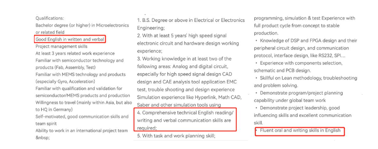 毫無疑問,當今電子行業(yè)站在世界前列的仍然是國外。工程師在做硬件設計的時候,需要閱讀大量的外文資料。有的工程師英語基礎薄弱,閱讀的時候使用翻譯軟件逐行翻譯,效率很低。你如果精通英文,可以直接閱讀世界上先進的技術文檔,用流利的口語與世界各地的工程師對話,在專業(yè)和職業(yè)上得到的機會也會更多。