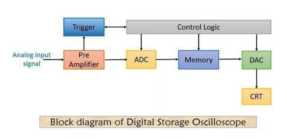 數(shù)字示波器包括數(shù)字化儀、放大器、分析儀電路、存儲器、波形重建、水平板、垂直板、陰極射線管或CRT、觸發(fā)器、時鐘、時基電路、時鐘和水平放大器。