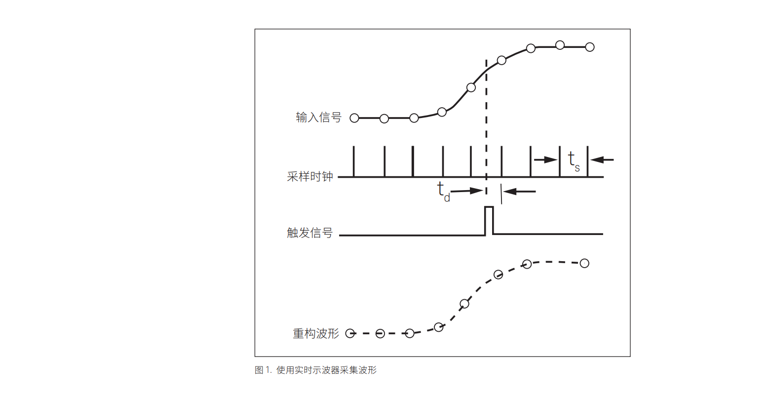 實時示波器可以根據(jù)數(shù)據(jù)本身的特征觸發(fā),通常是在輸入波形的幅度達到某個閾值 時發(fā)生觸發(fā)。這時,示波器開始將模擬波形異步轉(zhuǎn)換為數(shù)字數(shù)據(jù)樣點,轉(zhuǎn)換速率與 輸入波形的數(shù)據(jù)速率無關。該轉(zhuǎn)換速率稱為采樣率,通常來自內(nèi)部時鐘信號。如圖 1 所示,示波器對輸入波形的幅度進行采樣,將采樣值保存到存儲器中,然后繼續(xù) 進行下一次采樣。觸發(fā)器的主要任務是為輸入的數(shù)據(jù)提供一個水平時間參考點。