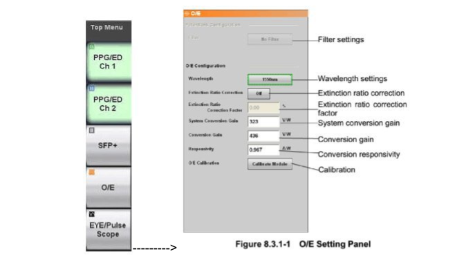 在儀表操作界面的頂端菜單上選擇 O/E, 可以打開光接口參數(shù)的相關(guān)設(shè)置, 如圖。選擇 Filter (濾波器)、