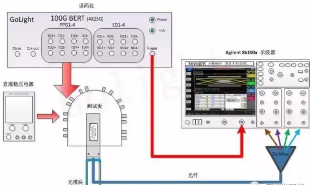 光模塊廠商一般將發(fā)射和接收端分別測試完的光模塊進行老化后再次進行模塊參數(shù)的檢測,以確定光模塊因老化而引起功能參數(shù)的變化。對模塊的測試在如上圖的測試方案中,能同時完成靈敏度和眼圖光學(xué)指標(biāo)的測量,在實際測試中可能需要兩臺誤碼儀來分別驅(qū)動兩塊測試板,要想只用一臺誤碼儀的兩路差分輸出分別驅(qū)動兩塊測試板,需要選擇高質(zhì)量碼型發(fā)生器(PPG)。