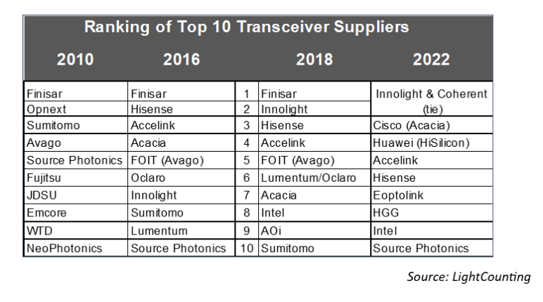 2022年,旭創(chuàng)科技(排名并列第1)、華為(排名第4)、光迅科技(排名第5)、海信寬帶(排名第6)、新易盛(排名第7)、華工正源(排名第8)、索爾思光電(排名第10)入圍。值得一提的是,索爾思光電被中國(guó)公司收購(gòu),故本期已是中國(guó)光模塊廠商。