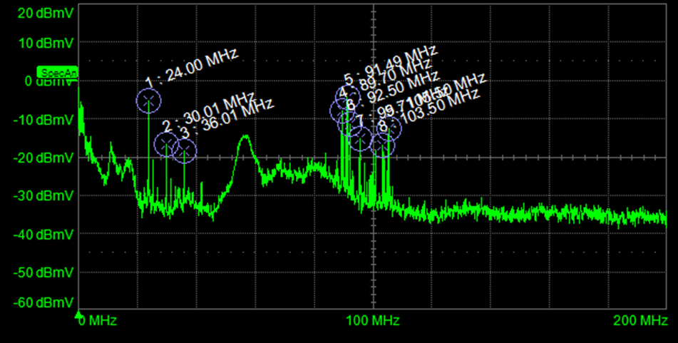 在查看RF干擾頻譜時,我們通??梢允叭√囟ǖ耐ㄐ判盘枴D5顯示了使用帶有大尖端環(huán)路的10倍探頭測量的USB供電設備中電源軌的實時頻譜。頻譜指紋顯示從87 MHz到108 MHz的FM無線電頻段的拾音。