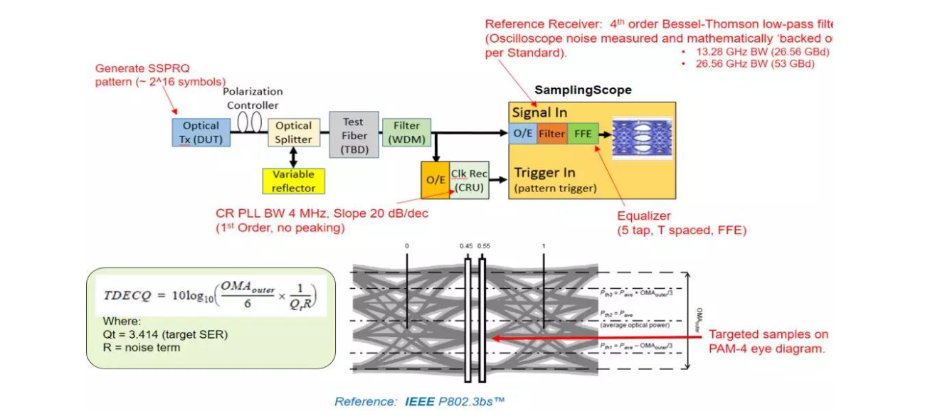 TDECQ通常用dB表示,對(duì)于PAM4信號(hào)來(lái)說(shuō),TDECQ值越小,表示這個(gè)信號(hào)相對(duì)于理想信號(hào)的功率裕量損失越小,或者說(shuō)能在光纖里傳輸更遠(yuǎn)的距離。根據(jù)802.3bs里的定義,TDECQ的參考測(cè)試方法如下圖所示: