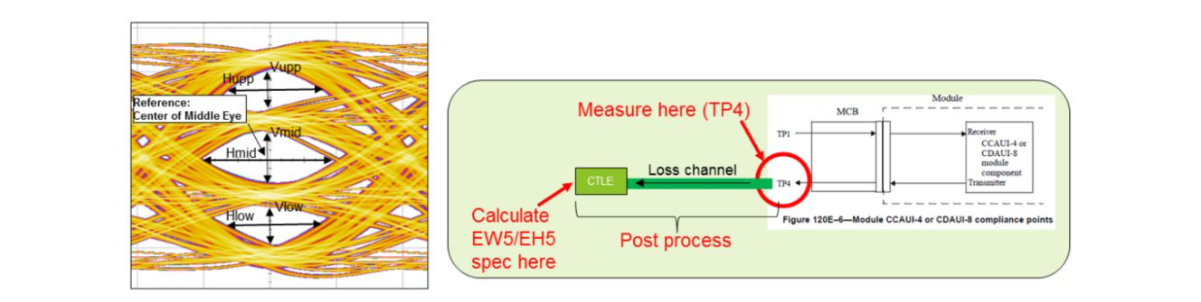 由于PAM4信號(hào)會(huì)形成3層眼圖,所以對(duì)每層眼圖要分別測(cè)量。在IEEE 802.3bs規(guī)范里,定義以中間層眼圖的中心位置為參考點(diǎn)計(jì)算眼高和眼寬。在測(cè)試過(guò)程中要更換不同的均衡器的值,并根據(jù)信號(hào)的噪聲和抖動(dòng)概率分布來(lái)計(jì)算等效的眼高和眼寬,這是一個(gè)非常復(fù)雜的計(jì)算過(guò)程,這里不做具體論述。