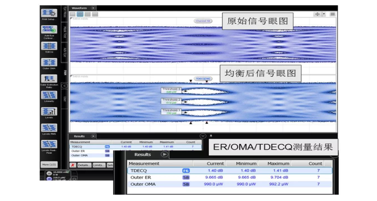 下圖是在采樣示波器里對(duì)均衡后光信號(hào)的參數(shù)進(jìn)行OMA、ER、TDECQ等參數(shù)測(cè)試的例子。我們可以看到,盡管很多測(cè)量參數(shù)的定義非常繁瑣,但基于示波器里的PAM4測(cè)量選件,使用者不需要繁瑣的操作,就可以快速得到需要的測(cè)量結(jié)果。