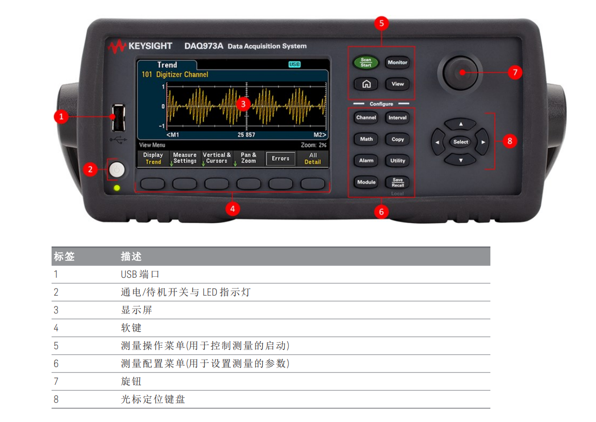 ? 簡(jiǎn)單易用的操作界面:DAQ970A 數(shù)據(jù)采集系統(tǒng)擁有一個(gè) 4.3 英寸的大型彩色顯示屏,可以清晰地顯示數(shù)據(jù)和狀態(tài)。系統(tǒng)還具有一個(gè)直觀的圖形前面板,包括面向任務(wù)的自引導(dǎo)菜單,可以方便地進(jìn)行系統(tǒng)設(shè)置、通道配置、掃描控制、數(shù)據(jù)查看等操作。系統(tǒng)還支持 U 盤,可以輕松地在獨(dú)立應(yīng)用軟件中復(fù)制和記錄數(shù)據(jù)。