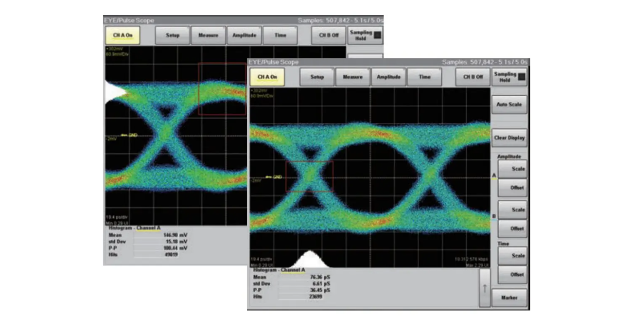 MP2100B內(nèi)置一項(xiàng)新的標(biāo)準(zhǔn)功能一快速采樣模式。除了提供與舊款產(chǎn)品相同的高速100k樣本/秒的采樣速度以外,新的快速采樣模式將采樣速度提高到150k樣本/秒,是傳統(tǒng)眼圖分析速度的1.5倍。