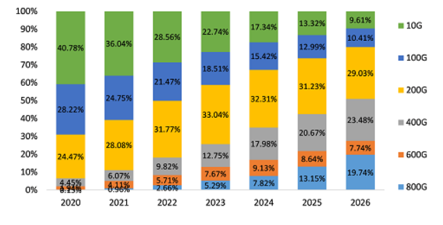 圖1:不同速率DWDM模塊滲透率發(fā)展趨勢(按出貨量)