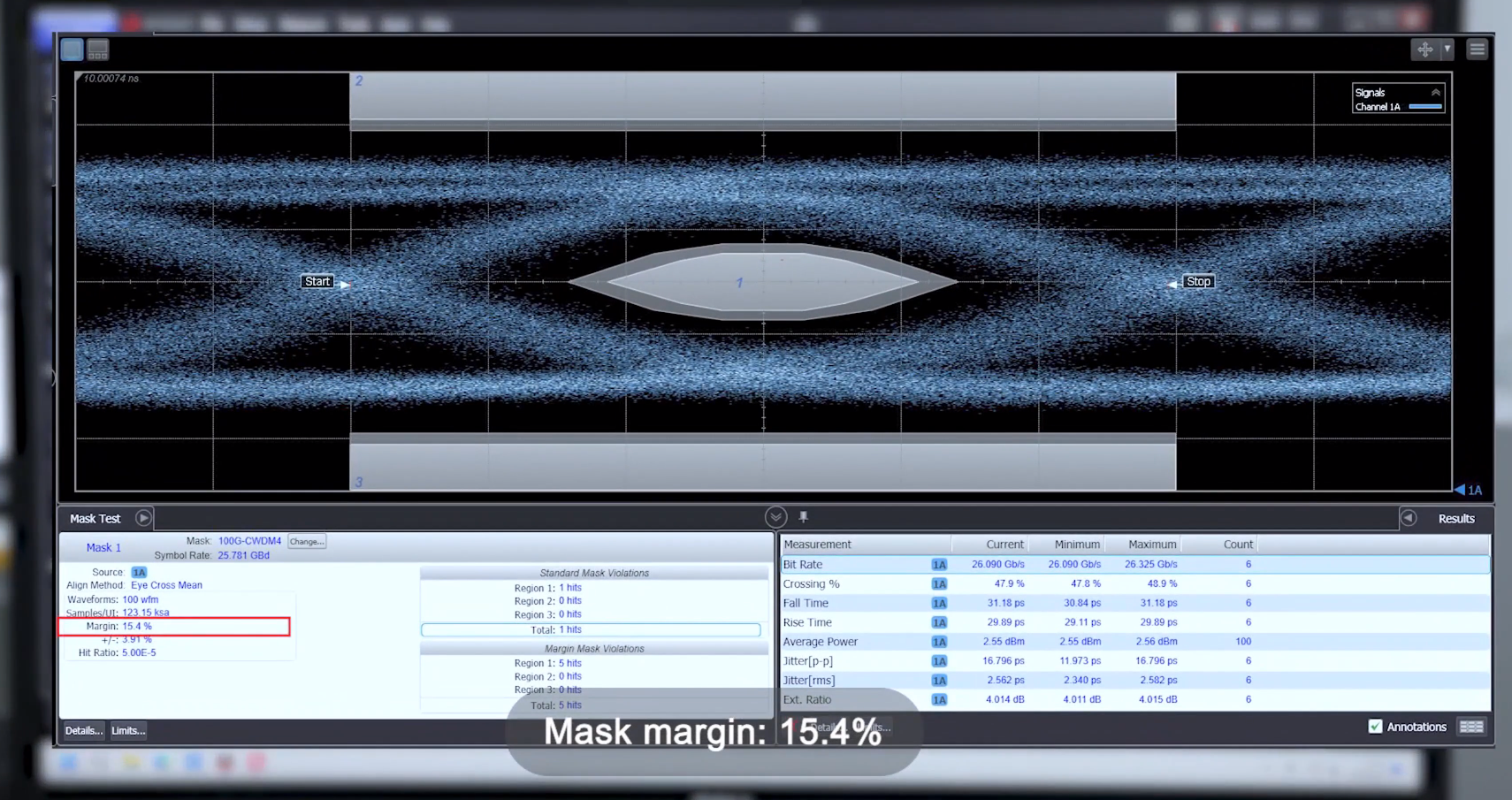 ?  測(cè)量眼圖的消光比和信噪比,分別表示信號(hào)的對(duì)比度和清晰度,反映了信號(hào)的強(qiáng)度和質(zhì)量特征。