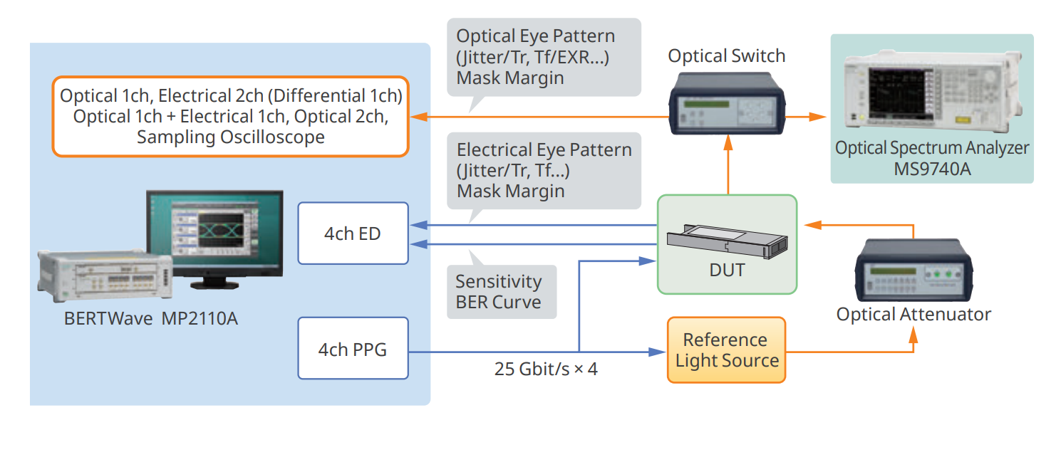 隨著網(wǎng)絡(luò)服務(wù)提供商推出各種新型應(yīng)用,數(shù)據(jù)量呈指數(shù)增長,100G 光模塊得到大量應(yīng)用, 為了提高生產(chǎn)效率,節(jié)約成本,光模塊制造商正努力尋找價格便宜但可擴展的測試儀器, 能夠支持從 10G 向 25G 或更高速率的平滑升級。 BERTWave MP2110A 針對 100 GbE/25 GbE 光學(xué)模塊生產(chǎn)應(yīng)用設(shè)計,將 BERT(誤碼率 測試)和采樣示波器(眼圖模式分析)集成于一體化機箱中。既可提高光模塊的生產(chǎn)效率, 也有助于降低生產(chǎn)成本。