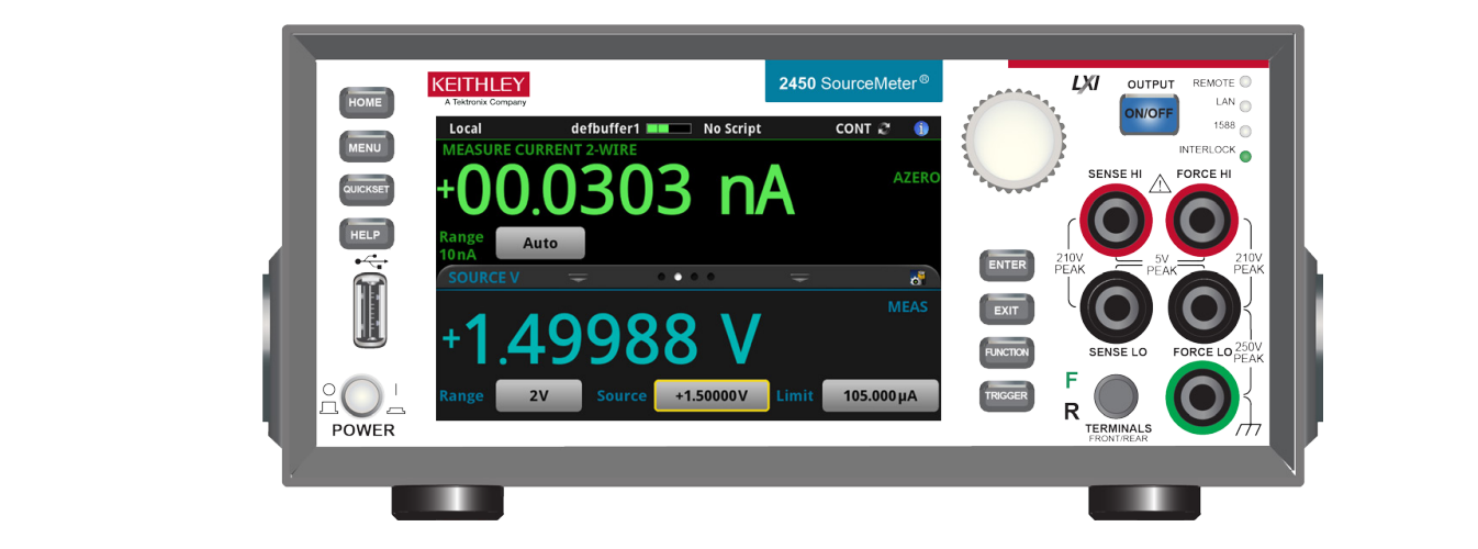 Model 2450 System SourceMeter? 儀器是一款精密的低噪聲儀 器,其中組合了穩(wěn)定的直流電源和可重復(fù)的高阻抗萬(wàn)用表。該 儀器的設(shè)計(jì)具有直觀的設(shè)置和控制、增強(qiáng)的信號(hào)質(zhì)量和擴(kuò)大的 量程,以及優(yōu)于市場(chǎng)上的類似產(chǎn)品的電阻率和電阻功能。 在同時(shí)擁有 6? 位分辨率時(shí)和 0.012% 的基本精度時(shí),2450 可以通過(guò) IEEE-488 bus 提供每秒 59 個(gè)讀數(shù)。在 4? 位精度 時(shí),每秒可向其內(nèi)部緩沖器讀入多達(dá) 1359 個(gè)讀數(shù)。