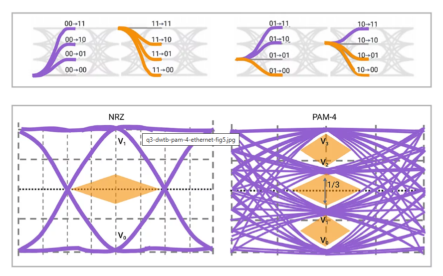 隨著互聯(lián)網(wǎng)的發(fā)展,數(shù)據(jù)中心和云計(jì)算的需求,網(wǎng)絡(luò)傳輸?shù)乃俣群蛶捯膊粩嗵岣摺D壳埃?00G以太網(wǎng)已經(jīng)成為數(shù)據(jù)中心的主流標(biāo)準(zhǔn),但是隨著5G、物聯(lián)網(wǎng)、人工智能等新技術(shù)的出現(xiàn),100G以太網(wǎng)已經(jīng)不能滿足未來(lái)的需求,400G以太網(wǎng)成為了新的目標(biāo)。然而,要實(shí)現(xiàn)400G以太網(wǎng),傳統(tǒng)的NRZ(非歸零)信令已經(jīng)不夠用了,因?yàn)樗牟ㄌ芈剩棵雮鬏數(shù)姆?hào)數(shù))和比特率(每秒傳輸?shù)谋忍財(cái)?shù))是相同的,也就是說(shuō),每個(gè)符號(hào)只能攜帶一個(gè)比特的信息。要想在相同的波特率下實(shí)現(xiàn)更高的比特率,就需要使用更高階的調(diào)制方式,例如PAM-4(4階脈沖幅度調(diào)制)信令,它可以在每個(gè)符號(hào)中攜帶兩個(gè)比特的信息,從而實(shí)現(xiàn)兩倍的比特率。因此,400G以太網(wǎng)改用PAM-4信令取代NRZ信令,是一種提高傳輸效率和降低成本的有效方法。