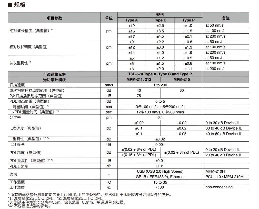 ?  高性能可調(diào)諧激光器TSL-570:該激光器是Santec的新品,具有高精度、高分辨率、高速的特點(diǎn),可用于WDL測(cè)試。該激光器可以和Santec的光功率計(jì)、光開關(guān)、偏振控制器無縫搭配,為WDL和PDL測(cè)試提供完整的解決方案