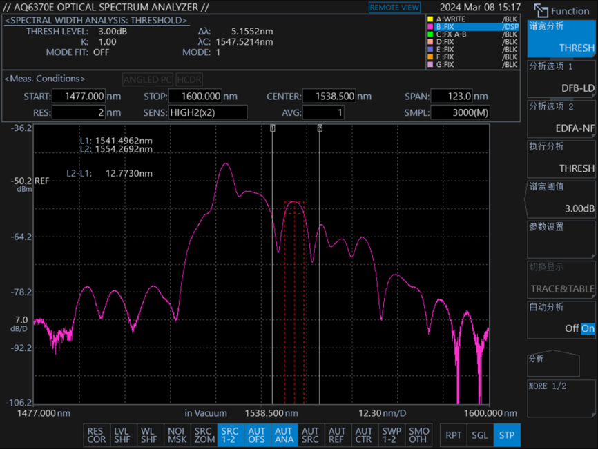 圖4:將整個(gè)掃描區(qū)間設(shè)定為執(zhí)行3dB譜寬分析且未開啟設(shè)定線標(biāo)記的L1、L2區(qū)間分析示意圖