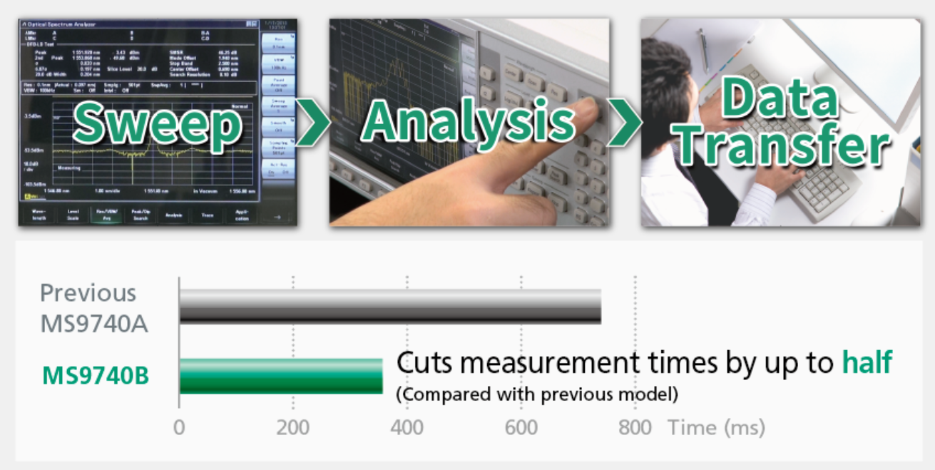 MS9740B與MS9740A的主要區(qū)別在于測量處理時間的縮短和對高速信號處理技術的應用。MS9740B在保持原有功能和性能的同時,將測量處理時間縮短了一半。這一點通過提高生產(chǎn)效率和減少測量及檢查時間來實現(xiàn),從而提高了光有源設備制造商的生產(chǎn)力。此外,MS9740B采用了先進的光學設計和高速信號處理技術,能夠在寬廣的波長范圍內(nèi)進行快速且準確的光譜分析。這包括從波形掃描到波形解析以及向外部控制設備的數(shù)據(jù)傳送,實現(xiàn)了最短0.2秒以下的整體測試速度。