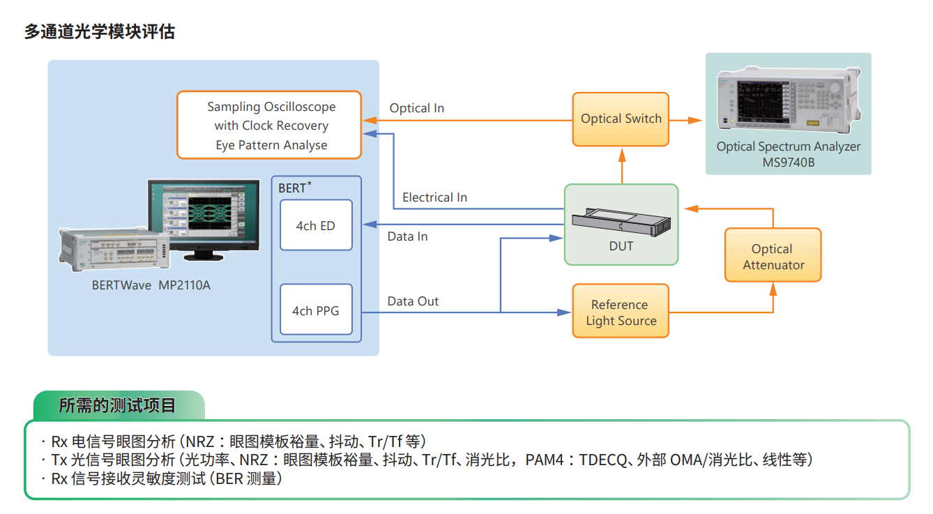 支持的應用:評估數(shù)據(jù)中心、核心網(wǎng)/城域網(wǎng)、4G/5G 移動回傳和 5G 移動前傳使用的 10G/25G/50G/100G/200G/400G/800G 光傳輸模塊,光纜以及相關部件的物理層性能 傳輸路徑: Ethernet、eCPRI/RoE、CPRI、SDH/SONET、OTN、InfiniBand、Fibre Channel 光收發(fā)器/模塊: SFP28、QSFP28、CFP2/4/8、SFP56、QSFP56、OSFP、QSFP-DD 電纜: Active Optical Cable(AOC)、Direct Attach Cable(DAC) 設備: TOSA、ROSA、High-Speed Optical Engine、PHY、Driver IC、CPO