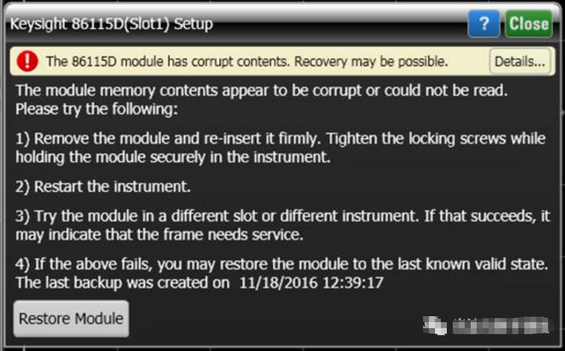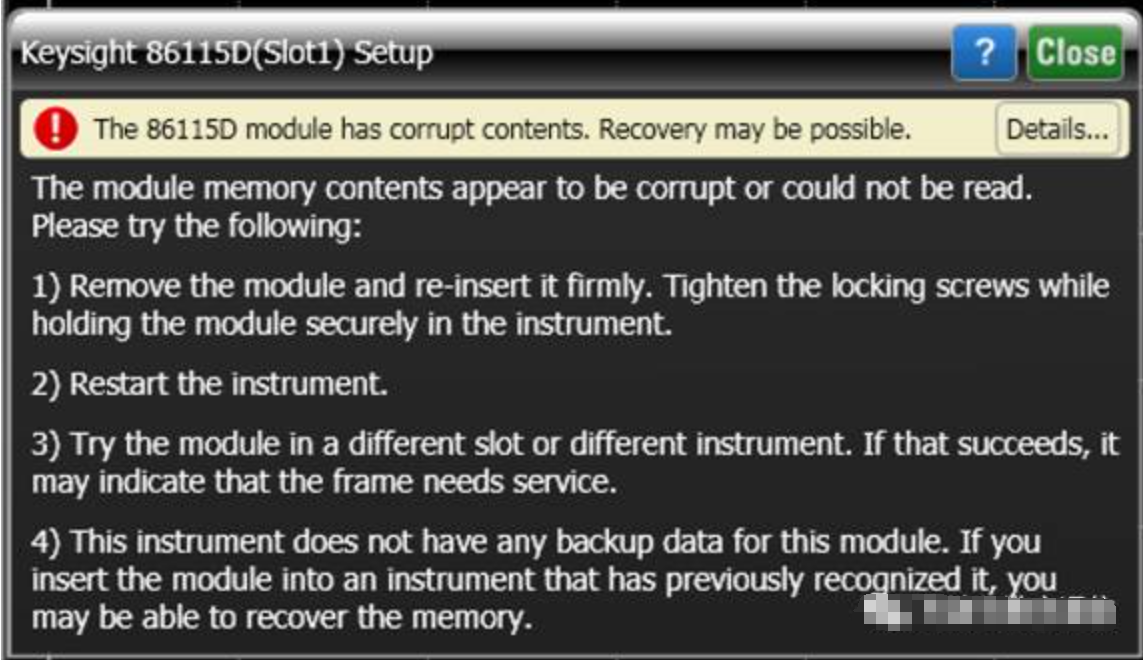 Keysight 86100D主機所搭配使用的模塊在使用過程中可能會由于模塊沒連接好造成模塊和主機的通信中斷,從而會導(dǎo)致模塊的系統(tǒng)數(shù)據(jù)丟失,一旦模塊數(shù)據(jù)丟失,主機會提示“module memory corruption”,發(fā)生該問題后我們通常需要將該模塊送至是德科技服務(wù)中心進(jìn)行模塊的初始化和校準(zhǔn)來恢復(fù)該模塊數(shù)據(jù)。