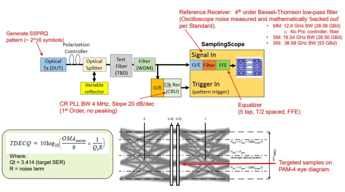 關(guān)鍵指標(biāo):TDECQ(Transmitter and dispersion eye closure for PAM4),衡量光發(fā)射機(jī)經(jīng)過光通道后PAM4信號功率裕量的損失。TDECQ的參考測試方法如下圖所示: