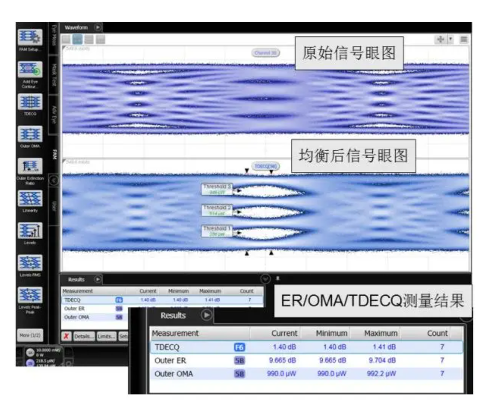 測試內(nèi)容:對光壓力信號由外圍消光比OER,外光調(diào)制幅度OOMA和壓力眼圖閉合代價SECQ來表征。