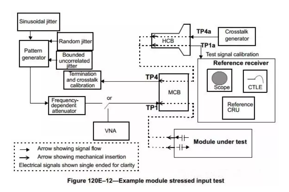 測試環(huán)境:參考電發(fā)射機(jī)(通常是碼型發(fā)生器)以及抖動注入源、碼間干擾源和串?dāng)_源,將壓力電信號輸入MCB夾具。
