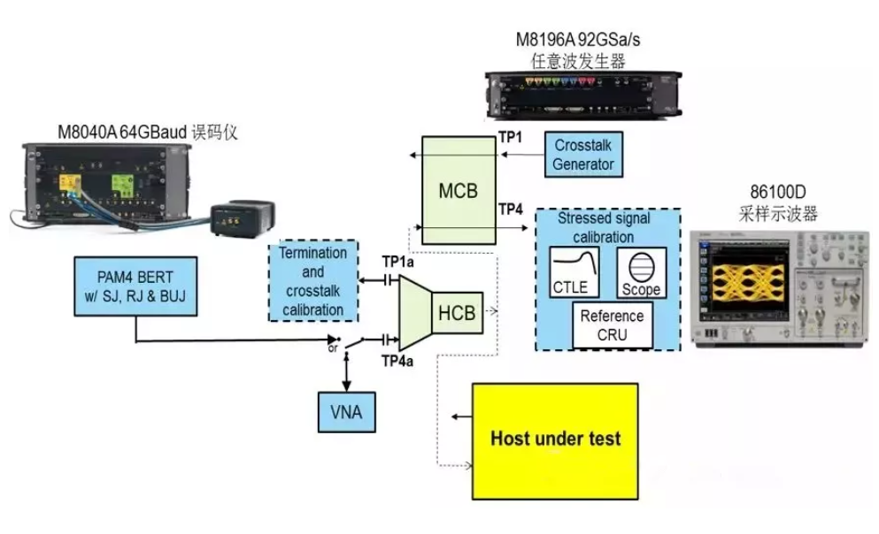 測試環(huán)境:參考的PAM4信號源與抖動、噪聲、碼間干擾注入源,以及參考的光發(fā)射機(jī)產(chǎn)生所需的光壓力信號。