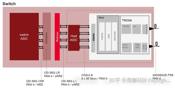 這裏突出顯示的是為數(shù)據(jù)中心互連子系統(tǒng)之間的傳輸而定義的技術標準。我們從左側的交換機 ASIC開始,它按照 CEI-56G 的定義傳輸?shù)胶谄矫妗V钡剿竭_主機 ASIC,CAUI 標準接管傳輸,也是在 56G PAM4 中。右側是傳輸變?yōu)楣鈱W的地方,也是在 PAM4 中。大多數(shù)傳輸都利用了 PAM-4 的各種速度等級。因此,很明顯,PAM4 已經廣泛部署用于數(shù)據(jù)中心互連。